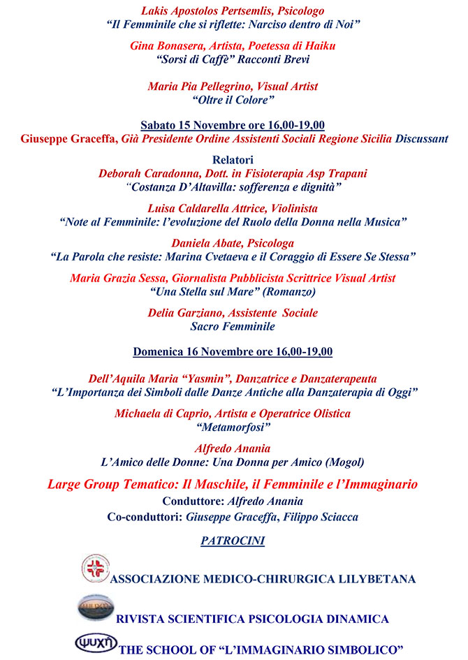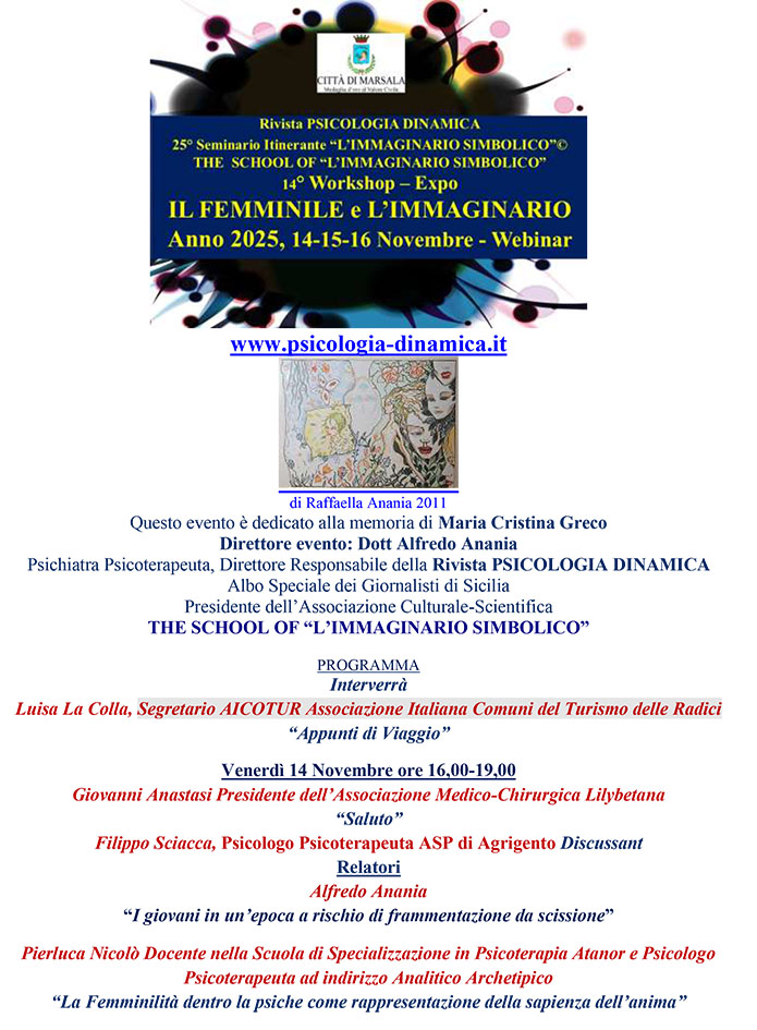 N.B. Qualora non interessi l'attestato la quota di partecipazione è € 20,00 Info Cell: 3389718617 Iscrizioni solo e-mail: anania.alfredo@psicologia-dinamica.it Il Workshop-Expo propone un modo diverso di accostarsi al mondo del femminile e alle sue molteplici e variegate problematiche, incrociando il contributi culturali e letterari con quelli psicologici e con in mondo delle Muse! Un mix suggestivo di modelli di moda femminile, cortometraggi, danze, dipinti, disegni, fotografie, opere grafiche, installazioni artistiche, brani letterari, brani musicali, poesie, saggi psicoanalitici e psicoantropologici, sculture, soggetti teatrali. Il Workshop articolando diversi modi comunicativi ed espressivi rappresenta un significativa e ormai tradizionale cornice entro la quale approfondire e confrontare i diversi aspetti del femminile e dell’ “anima” nell’incontro dinamico con se stessa e con l’“animus”. L’evento si propone sotto forma di un percorso in più giornate nel quale calarsi collettivamente e in tutti i suoi momenti! (Alfredo Anania 01/02/2018). |
